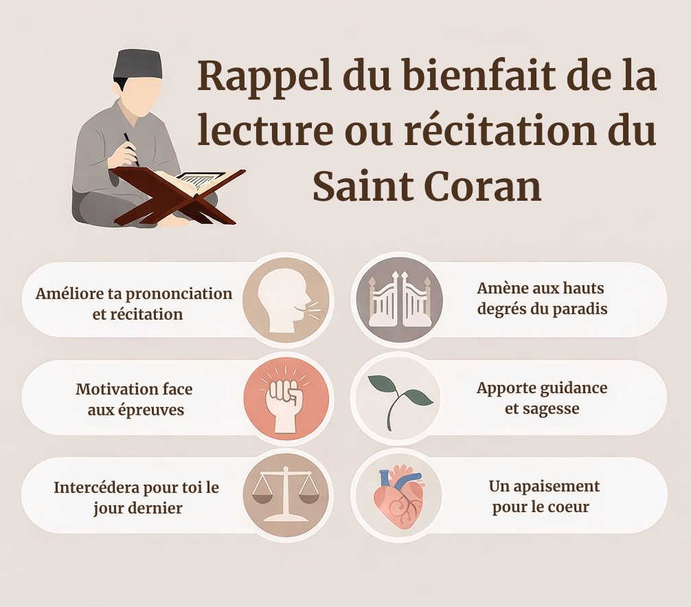 « Celui qui récite une lettre du Coran recevra une récompense, et cette récompense sera multipliée par dix. » (Rapporté par At-Tirmidhi)